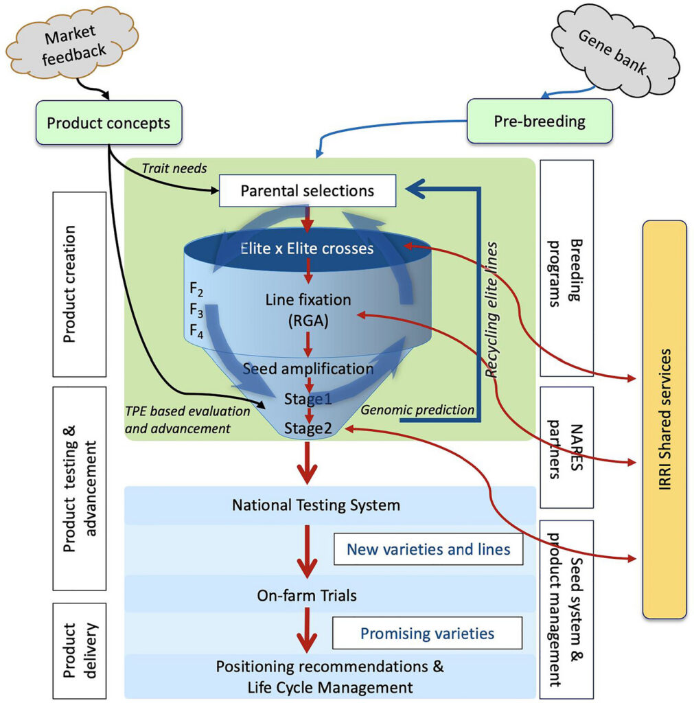 1. Market-driven product design: The journey begins not in the lab, but in the marketplace. IRRI employs rigorous market research to define “market segments”, groups of farmers or consumers with similar demands for a rice variety that consider factors like maturity, grain type, and growing environment. These insights are translated into “product concepts” (also known as Target Product Profiles or TPPs), which are detailed lists of traits that new varieties must possess to meet market needs and outperform existing benchmark varieties. Through a global survey, IRRI has prioritized 24 market segments, with 11 currently addressed by active breeding pipelines. This ensures that breeders are developing varieties that farmers want to grow and consumers want to eat.
