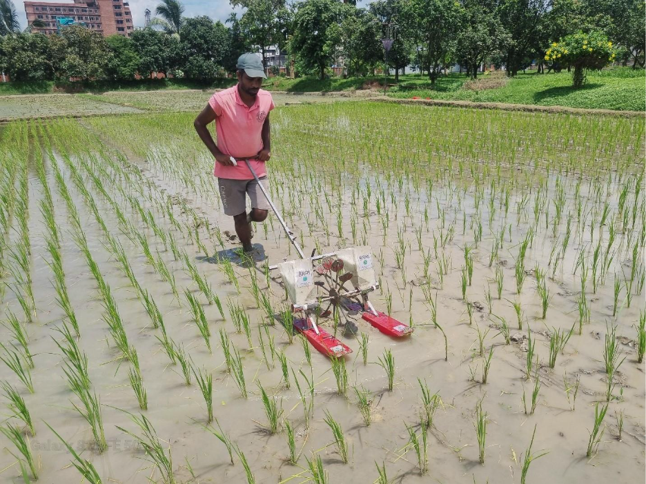 Applying fertilizers based on crop demand (for example using the Rice Crop Manager App by IRRI), soil testing, use of slow-release or coated fertilizers, deep placement of urea, and spraying of nano urea are possible options to increase nitrogen fertilizer efficiency and reduce emissions. Bangladesh once tried to expand Guti Urea, but the experiment failed primarily due to a suitable applicator, supply chain issues, lack of information, soil type limitations, and higher labor costs for its application. Recently, BRRI developed the innovation called prilled urea deep placement, which involves inserting controlled amounts of urea into moist soil using an applicator, typically directly below the soil surface. This targeted approach improves nitrogen use efficiency by reducing volatilization and runoff, ultimately lowering GHG emissions. Challenges of the process include required line transplanting as well as maintaining a specific line-to-line distance.