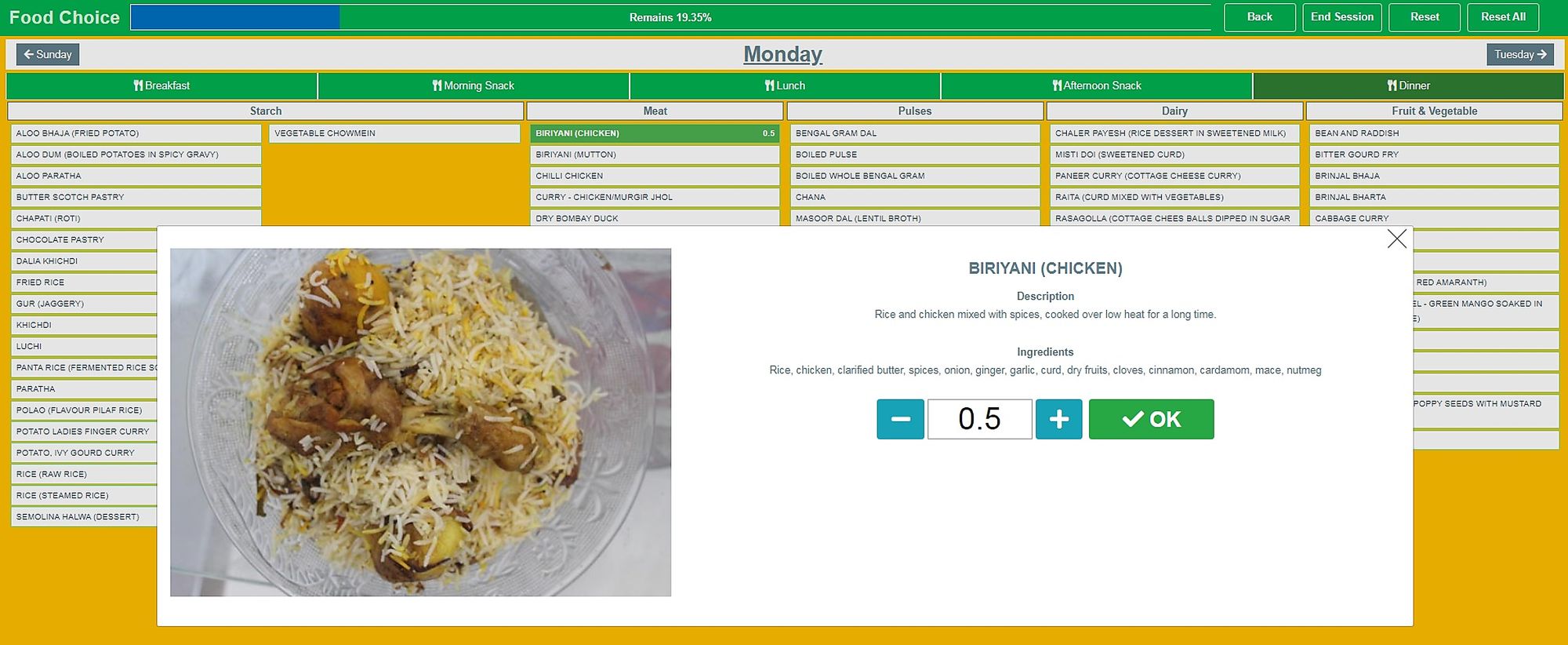 At the heart of their experiment was the Food Choice App (FCA), a digital tool developed by IRRI. The app simulates a digital food environment where respondents plan a weekly diet for their household. Featuring 162 unique Bengali dishes across five eating occasions over seven week-days, each dish is meticulously standardized for nutritional content and cost. Respondents interacted with the app on tablets, managing a randomized food budget represented by a real-time “budget bar”.
