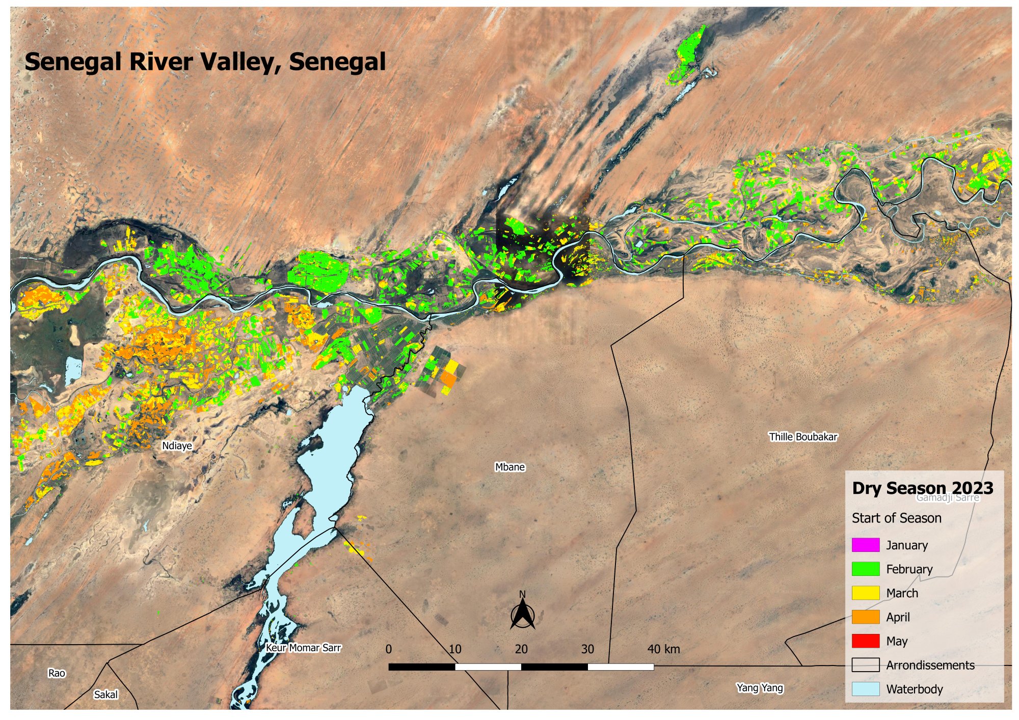 In the Senegal River Valley, 36,300 and 21,200 ha (total 66,000 ha) of irrigated rice were mapped as cropped with rice during the dry season and the wet season, respectively. These values confirmed that rice is essentially cropped as a mono-season crop, and that there has been a shift in cropping schedules and systems compared to the past decade, with a current dominance of rice cropping during the dry season. This was made possible by an improvement in irrigation infrastructure which allowed more systematic and extended dry rice cultivation, leveraging more favorable climatic environment, earlier crop establishment with higher yield, while avoiding pests and diseases more prevalent during the wet season.