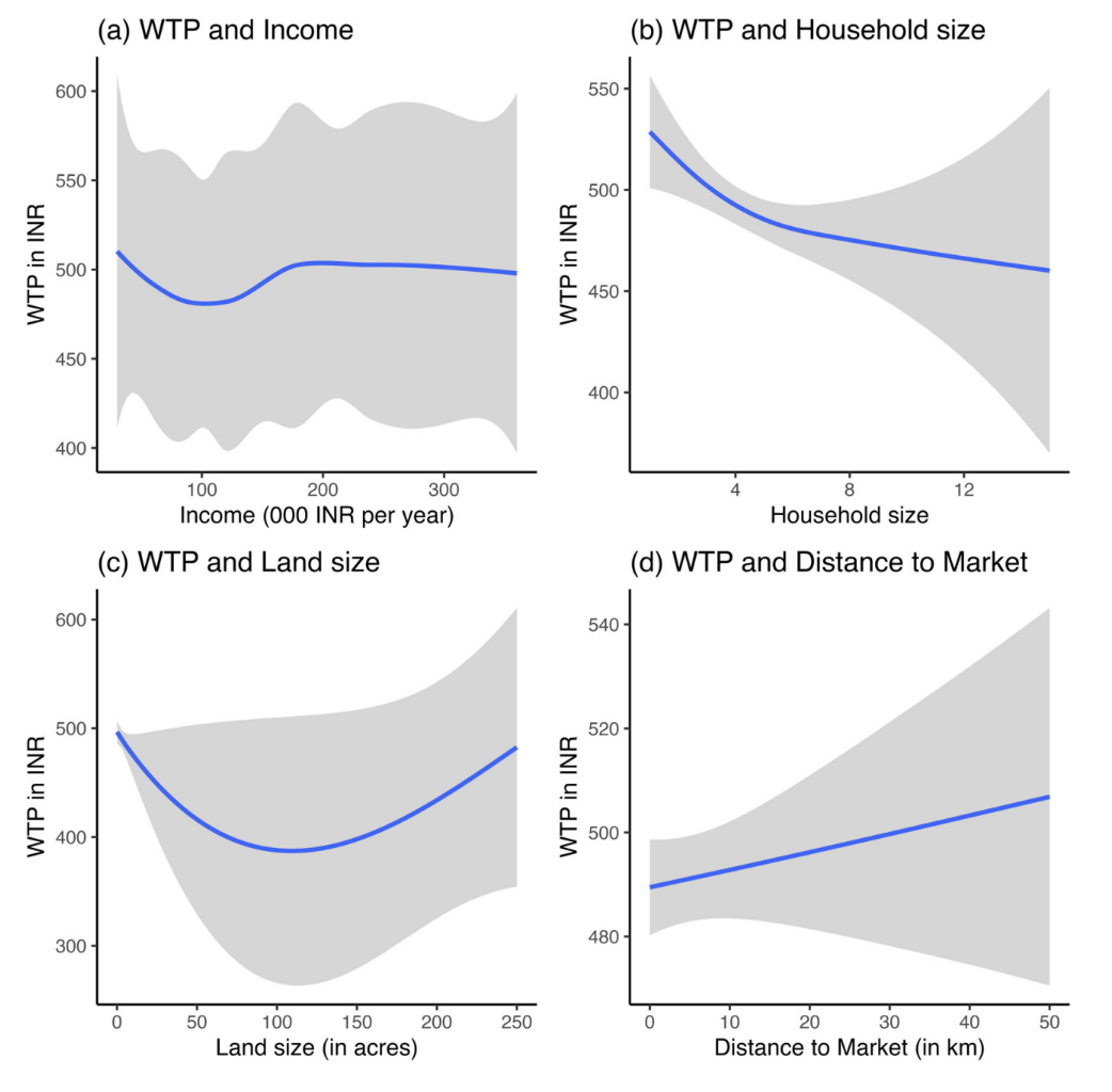 Willingness to pay (WTP) also varies depending on different attributes. Farmers with high levels of general knowledge and awareness of how insurance works are more willing to pay less. Those who earn an annual income of less than INR100,000 (~USD1,100) are less likely to purchase the product. Similarly, larger households are less inclined to be insured.